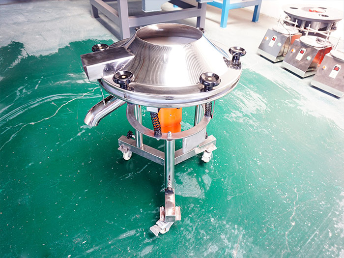 450過濾篩——直徑為450mm,由電機(jī)驅(qū)動(dòng)重錘激振,篩體產(chǎn)生水平、垂直、傾斜的三次元運(yùn)動(dòng),使含水物料在篩網(wǎng)上被拋起并由中央向外旋轉(zhuǎn)擴(kuò)散到出料口排出,含水物料在篩網(wǎng)上面的運(yùn)動(dòng)中,細(xì)小顆粒或液體透過篩網(wǎng),通過選擇安裝相應(yīng)的篩網(wǎng)和篩網(wǎng)層數(shù)使物料完成篩選分級(jí)或過濾,分選出的物料由各自的出料口分別自動(dòng)排出。是一臺(tái)單層篩分和過濾使用的振動(dòng)篩,被各個(gè)廠家和用戶叫做液體專用振動(dòng)篩,因?yàn)闄C(jī)身小的原因,所以它的處理量不多,適用于小產(chǎn)能要求。