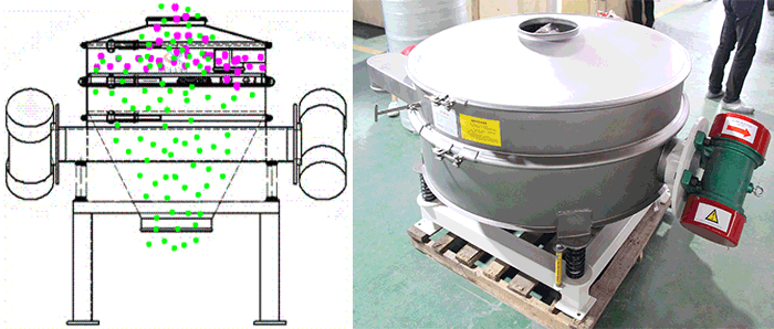 旋振篩,由單臺(tái)立式振動(dòng)電機(jī)作激振源,電機(jī)上、下兩端安裝有偏心重錘,將電機(jī)的旋轉(zhuǎn)運(yùn)動(dòng)轉(zhuǎn)變?yōu)樗?、垂直、傾斜的三次元運(yùn)動(dòng),再把這個(gè)運(yùn)動(dòng)傳遞給篩面,使物料在篩面上做外擴(kuò)漸開(kāi)線運(yùn)動(dòng),故該系列振動(dòng)篩稱之為旋振動(dòng)篩。