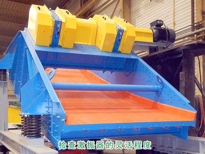 檢查激振器的靈活程度,用手轉(zhuǎn)動皮帶輪使偏心塊脫離平衡位置后,應(yīng)出現(xiàn)數(shù)次自由擺動,如篩子到貨后時間超過半年后才安裝,激振器應(yīng)全部拆下重新清洗加油。