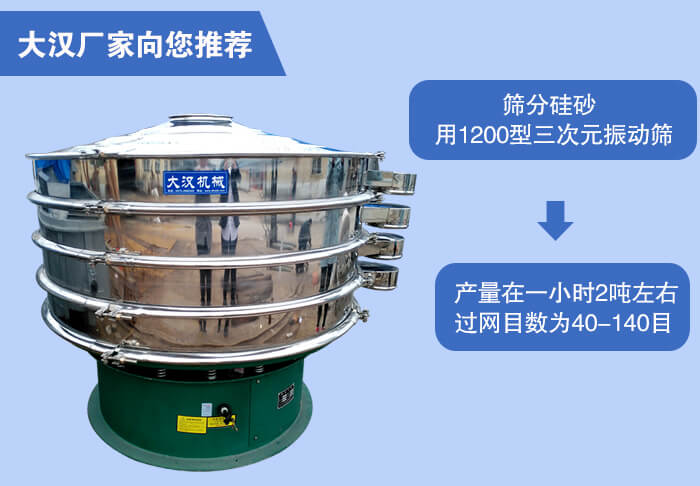 近期有客戶詢問我們銷售客服問篩分烘干后的硅砂產量在一小時2噸左右,過網目數為40-70目、70-140目適合用什么型號的振動篩,小編根據客戶所篩分的物料與過網數目和產量推薦使用1200型三次元振動篩