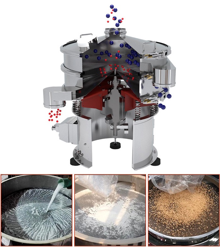 氣旋篩使用一組槳葉將產品推出篩網圓柱體,高速旋轉它們并對產品施加離心力,圓柱體水平安裝,因此對槳葉施加輕微的扭轉以將產品沿著圓柱體的長度向下移動,并且使用螺旋鉆以穩(wěn)定的速度喂入槳葉。與振動篩相比,這些槳葉迫使產品通過篩網,從而使它們具有更高的吞吐量,旋轉螺旋鉆和槳葉組件的運動具有分解塊或分離壓實產品的額外好處。
