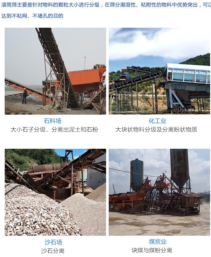 滾筒篩由一個穿孔的圓柱形滾筒組成,該滾筒通常在進料端以一定角度升高,當進料沿旋轉(zhuǎn)滾筒螺旋向下時實現(xiàn)物理尺寸分離,其中小于篩孔的尺寸過小的材料通過篩網(wǎng),而尺寸過大的材料從滾筒的另一端排出,用于粘性和纖維材料的分類,例如在煤炭或天然石材工業(yè)中。