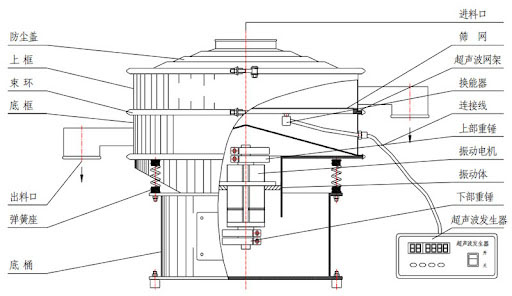 流通式超聲波篩由防塵蓋、進料斗、超聲波振動系統(tǒng)、篩網、出料口、減震底座、電機等組成。超聲波換能器均勻分布于篩網兩側,通過高頻振動快速破除物料粘連,搭配耐磨不銹鋼篩網,實現(xiàn)精細分級。中間層設導流板引導物料流通,底部減震底座采用橡膠減震墊,減少運行噪音與設備損耗。