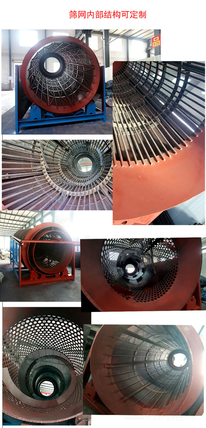 當物料進入重型滾筒篩內(nèi)部篩網(wǎng)時,由于滾筒裝置的傾斜與轉(zhuǎn)動,使篩面上的物料翻轉(zhuǎn)與滾動,使合格物料(篩下產(chǎn)品)經(jīng)滾筒外圓的篩網(wǎng)排出,不合格的物料(篩上產(chǎn)品)經(jīng)滾筒末端排出。由于物料在滾筒內(nèi)的翻轉(zhuǎn),滾動,使卡在篩孔中的物料可被彈出,防止篩孔堵塞。