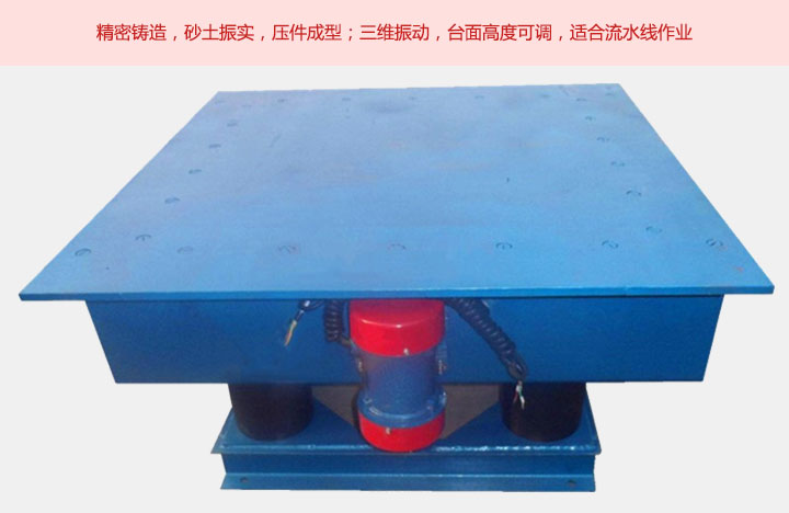 鑄造用振動平臺采用橡膠彈簧和6臺-8臺振動電機(jī)組合,具有上下,左右前后的三維振實(shí)效果,它具有多結(jié)構(gòu)支撐,結(jié)構(gòu)牢固,密封性好,性能可靠,操作簡單,振動頻率可調(diào)等特點(diǎn)。
