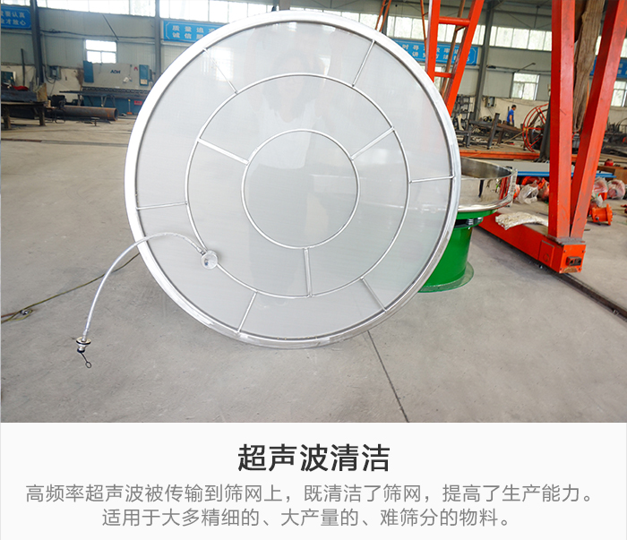 超聲波清潔:高頻率超聲波被傳輸?shù)胶Y網(wǎng)上,既清潔了篩網(wǎng),又顯著提高了生產(chǎn)能力。適用于大多精細(xì)的、大產(chǎn)量的、難篩分的物料。